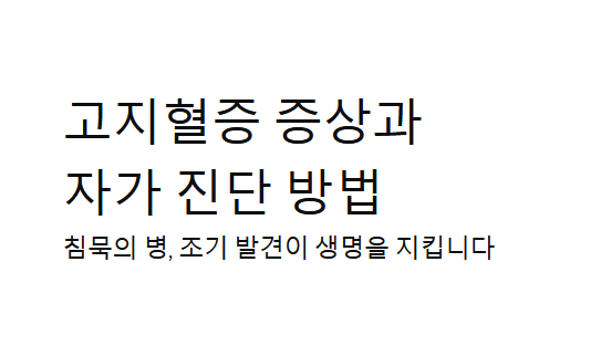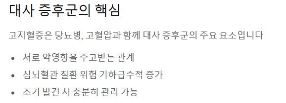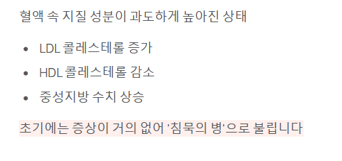 - 위험성: 고지혈증 자체보다는 이로 인해 발생하는 **합병증(심혈관 질환)**이 생명을 위협합니다.