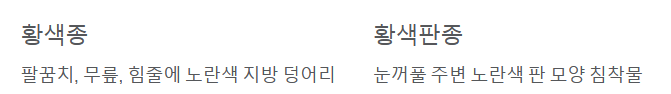 | 황색판종 (Xanthelasma) | 눈꺼풀 주변에 생기는 노란색 판 모양의 침착물로, 콜레스테롤 수치가 높을 때 나타날 수 있습니다. | 고콜레스테롤 |
