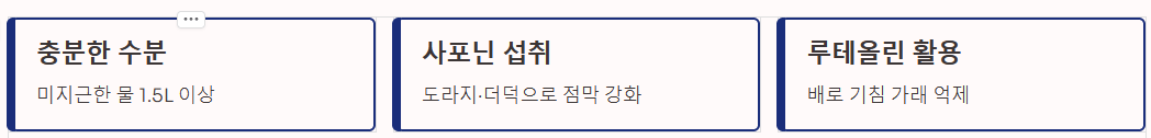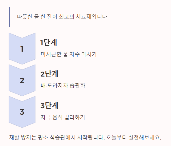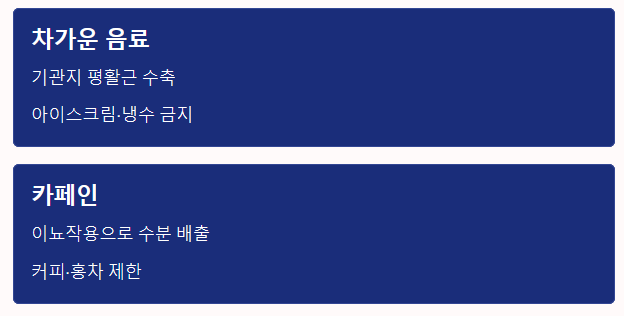 - 피해야 할 것: 카페인, 알코올, 차가운 음료는 이뇨 작용과 혈관 수축을 유발해 좋지 않습니다.