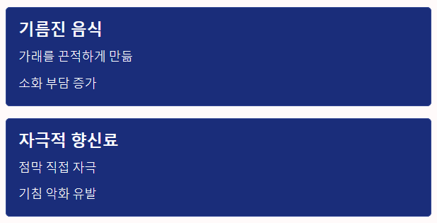 - 자극적인 향신료: 너무 맵거나 신 음식은 목 점막을 직접적으로 자극하여 기침을 악화시킵니다.