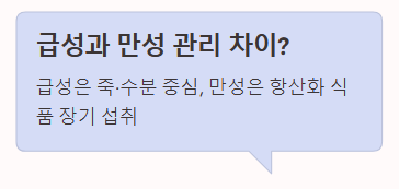 기본 원리는 같습니다. 다만 급성일 때는 소화가 잘 되는 죽 형태와 수분 섭취에 집중하고, 만성일 경우 평소 면역력을 높이는 항산화 식품(채소, 과일)을 꾸준히 식단에 포함하는 장기적인 관리가 필요합니다.
