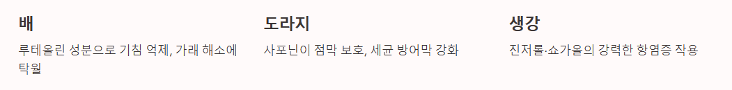 | 도라지 | 사포닌, 이눌린 | 점막 보호, 면역 강화 | 도라지청, 무침, 차 |
