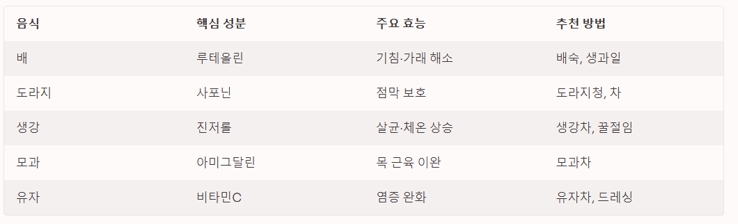 | 배 | 루테올린 | 기침 억제, 가래 해소 | 배숙(꿀과 함께 찜), 생과일 |