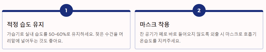 - 마스크 착용: 찬 공기가 폐로 바로 들어오지 않도록 외출 시에는 마스크를 착용해 호흡기의 온습도를 유지해야 합니다.