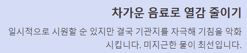 일시적으로 목의 열감을 내려 시원한 느낌을 줄 수 있지만, 추천하지 않습니다. 찬 음식은 기관지 수축을 유발해 결국 기침을 더 심하게 만들 수 있습니다.