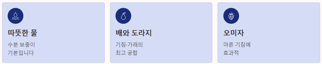 - 따뜻한 물: 기침 관리의 기본은 수분입니다. 찬물은 피하고 미지근한 물을 수시로 마셔야 합니다.