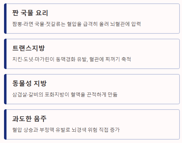 - 짠 국물 요리: 한국인의 뇌졸중 주요 원인 중 하나는 과도한 나트륨 섭취입니다. 짬뽕, 라면 국물, 젓갈류는 혈압을 급격히 올려 뇌혈관에 압력을 가합니다.