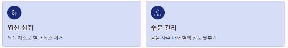 - 수분 관리: 물을 자주 마셔 혈액의 점도를 묽게 유지하는 것이 기본 중의 기본입니다.