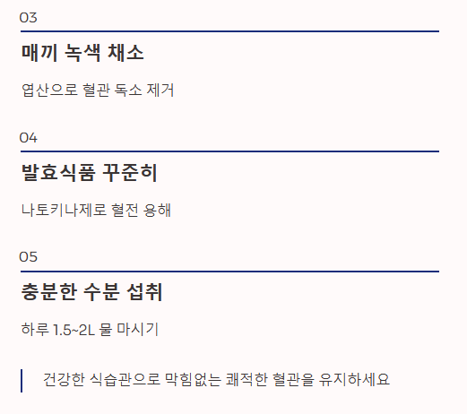 - 엽산 섭취: 시금치, 브로콜리 등 녹색 채소는 혈관 독소인 호모시스테인을 줄여줍니다.