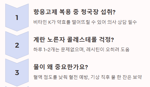 매우 중요한 질문입니다. 와파린 같은 항응고제를 복용 중이라면 청국장이나 콩류, 녹색 채소에 든 비타민 K가 약효를 떨어뜨릴 수 있습니다. 반드시 담당 의사와 상의하여 섭취량을 조절해야 합니다.