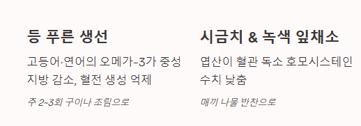 - 오메가-3: 등 푸른 생선은 혈액 속 중성지방 수치를 낮춰 피를 맑게 합니다.
