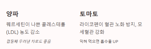 주요 음식들이 뇌혈관에 미치는 영향과 먹는 방법을 표로 정리했습니다.