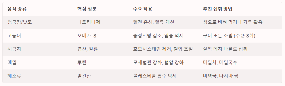 | 청국장/낫토 | 나토키나제 | 혈전 용해, 혈류 개선 | 생으로 비벼 먹거나 가루 활용 |