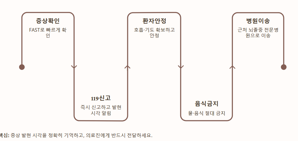 - 뇌졸중 의심 시 'FAST' 원칙(얼굴 마비, 팔 마비, 언어 장애, 시간)을 기억하고 즉시 119에 신고해야 합니다.