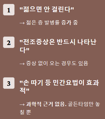 - "젊으면 뇌졸중 위험이 없다?"진실: 젊은 층에서도 뇌졸중 발생률이 증가하고 있습니다. 연령과 관계없이 위험 요인을 관리하는 것이 중요합니다.