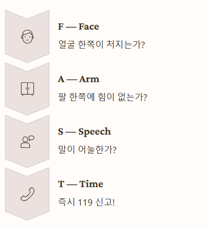 - T (Time to call 911/119): 위 증상이 하나라도 있다면 즉시 119에 전화하세요!