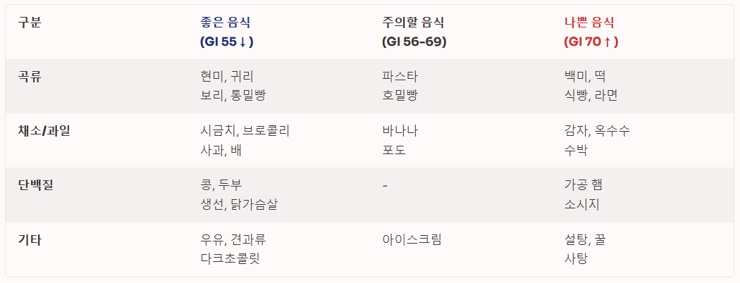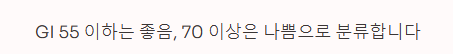 구분좋은 음식 (GI 55 이하)주의할 음식 (GI 56~69)나쁜 음식 (GI 70 이상)