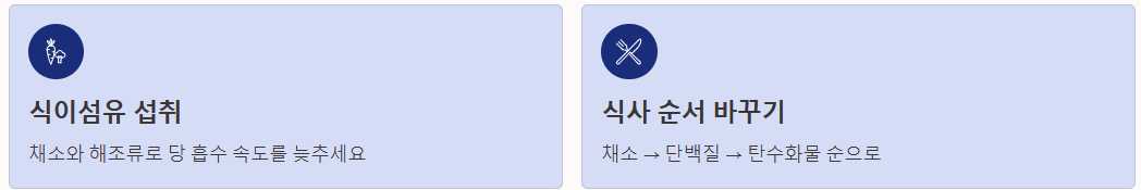 - 식사 순서 바꾸기: 채소 → 단백질 → 탄수화물 순서로 먹는 것만으로도 혈당 스파이크를 예방할 수 있습니다.