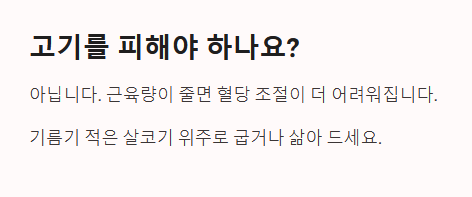 아닙니다. 근육량이 줄어들면 포도당을 저장할 곳이 없어 혈당 조절이 더 어려워집니다. 기름기가 적은 살코기 위주로 삶거나 굽는 방식으로 적정량의 단백질을 반드시 섭취해야 합니다.