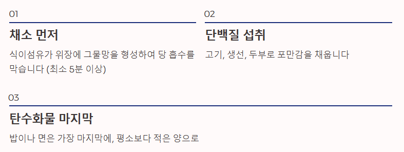 - 탄수화물 마지막: 밥이나 면은 가장 마지막에, 평소보다 적은 양을 먹습니다.