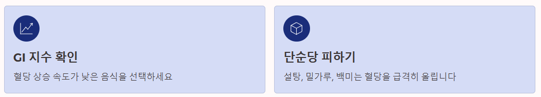 - GI 지수(혈당 지수) 확인: 음식을 섭취한 뒤 혈당이 상승하는 속도를 나타내는 수치가 낮은 음식을 선택해야 합니다.