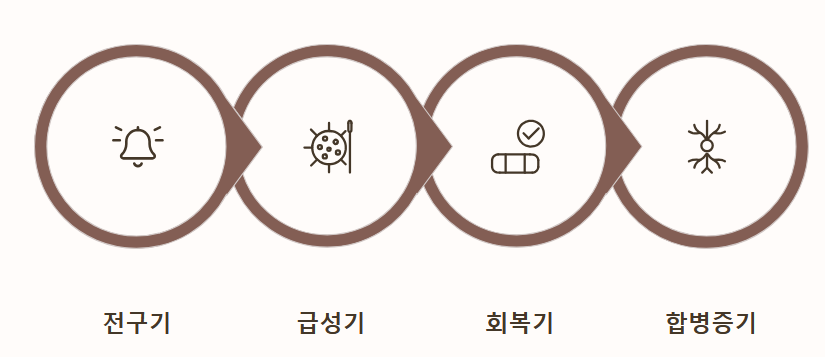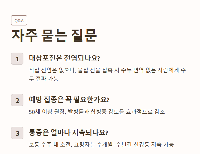 | 합병증기 (일부) | 대상포진 후 신경통, 안구/뇌 합병증 | 발진이 사라진 후에도 통증이 수개월~수년 지속될 수 있음 |