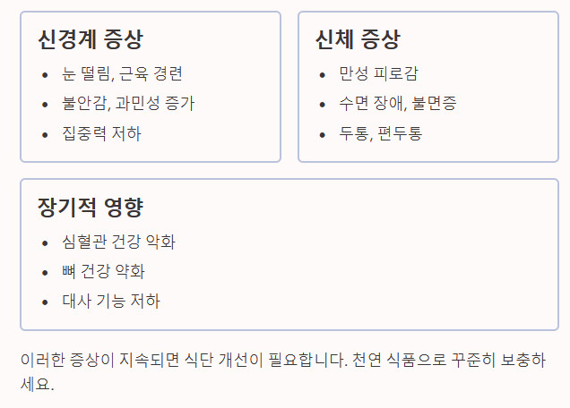 마그네슘 섭취 효율을 떨어뜨리거나 부작용을 유발할 수 있는 요인들을 관리해야 합니다.
