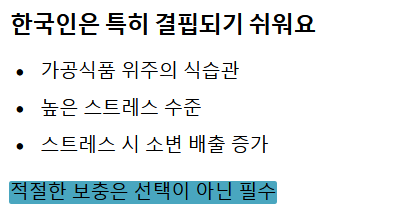 특히 가공식품 위주의 식습관과 스트레스가 많은 한국인은 마그네슘이 결핍되기 쉽습니다. 스트레스를 받으면 우리 몸은 평소보다 더 많은 마그네슘을 소변으로 배출하기 때문입니다. 따라서 적절한 보충은 선택이 아닌 필수라고 할 수 있습니다.