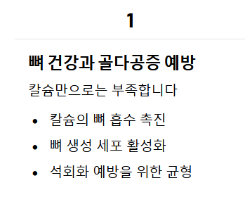 - 뼈 건강 강화: 칼슘의 흡수를 돕고 뼈 밀도 유지