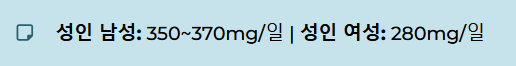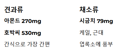 | 견과류 | 아몬드(270mg), 호박씨(530mg) | 간식으로 섭취하기 가장 간편함 |