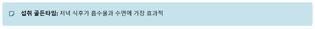 - 섭취 골든타임: 저녁 식후 섭취가 수면과 흡수율에 유리
