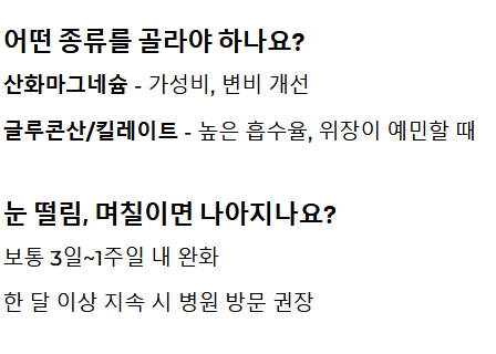 Q3. 눈 떨림이 있는데 며칠 먹어야 효과가 있나요? 개인차는 있지만, 단순 결핍에 의한 떨림이라면 보통 3일~1주일 정도 꾸준히 섭취하면 증상이 완화됩니다. 한 달 이상 지속된다면 다른 신경계 문제일 수 있으니 병원을 방문하세요.