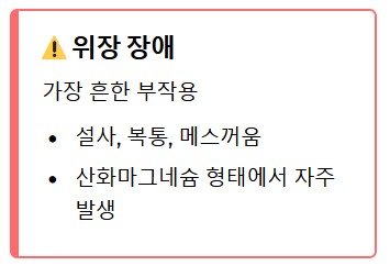 - 위장 장애: 가장 흔한 부작용으로 설사, 복통, 메스꺼움이 나타날 수 있습니다. 산화마그네슘 형태에서 자주 발생합니다.