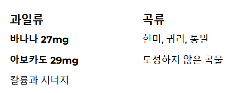 | 과일류 | 바나나(27mg), 아보카도(29mg) | 칼륨도 풍부해 시너지 효과 |