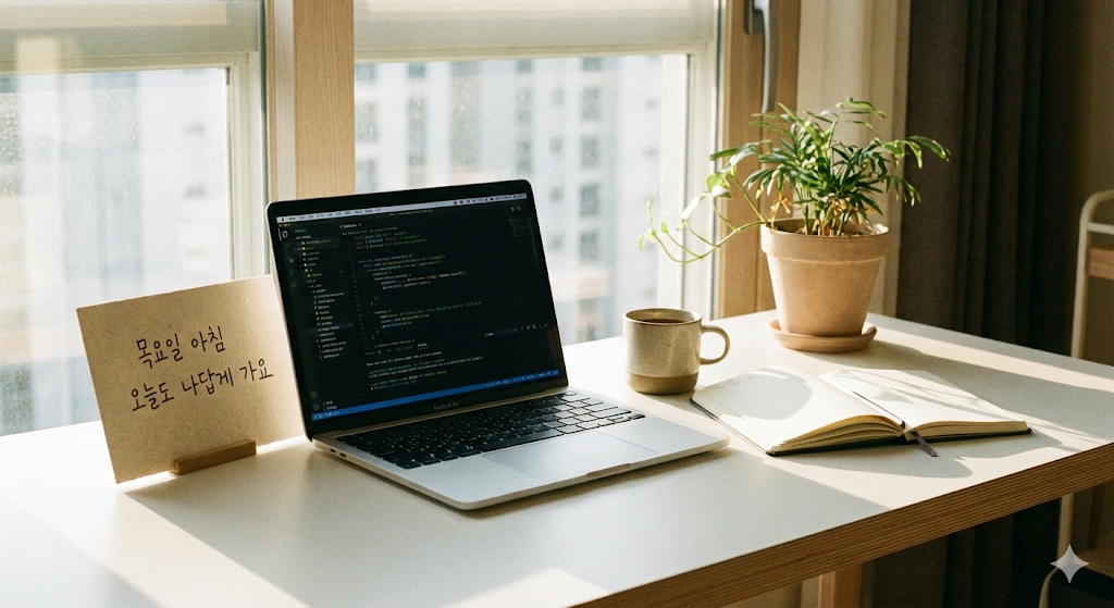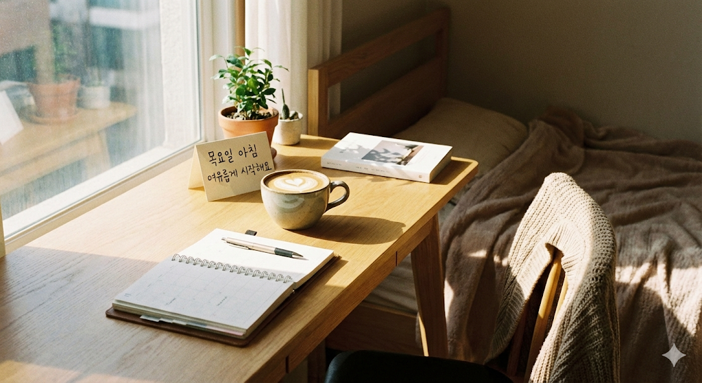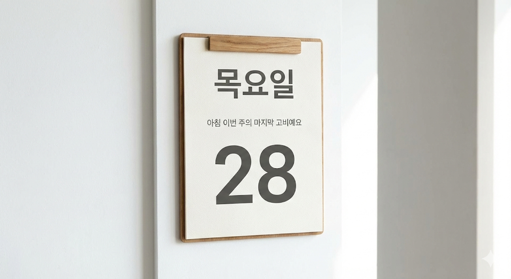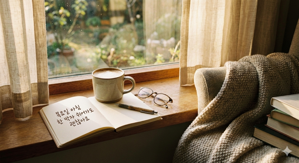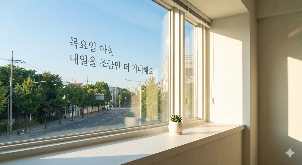목요일은 시각적으로 '편안함'과 '활력'을 동시에 주어야 합니다. 너무 화려한 파티 이미지는 오히려 상대적 박탈감을 줄 수 있고, 너무 우울한 이미지는 기운을 빠지게 합니다.