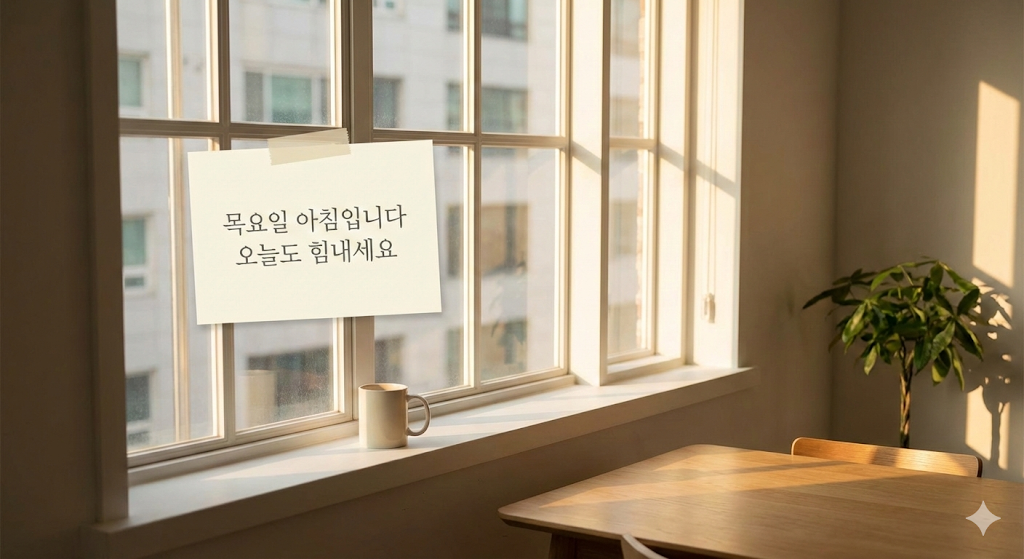 목요일 아침 인사는 지친 일상에 찍는 '쉼표'와 같습니다. 거창한 말보다 "많이 피곤하시죠? 힘내세요"라는 진심 어린 한마디가 상대방에게는 링거 주사보다 더 큰 힘이 될 수 있습니다.