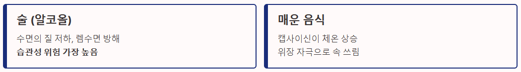 - 매운 음식: 고춧가루의 캡사이신은 체온을 높이고 위장을 자극하여 속 쓰림을 유발, 깊은 잠을 방해합니다.