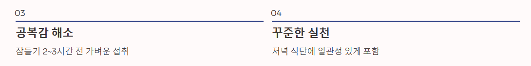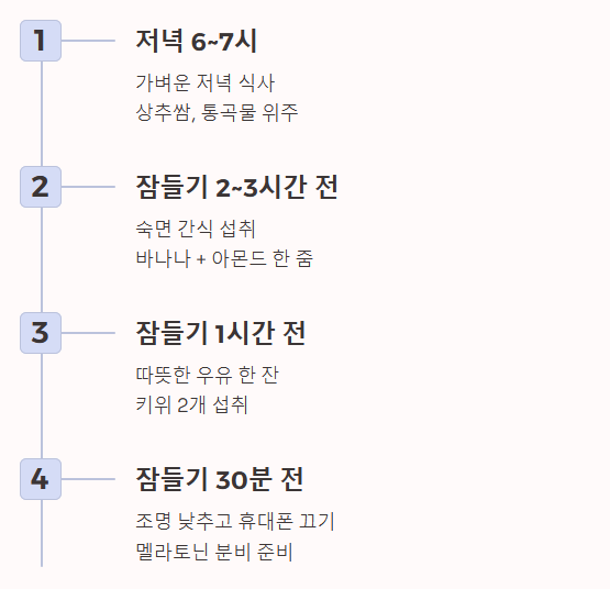 - 공복감 해소: 배가 너무 고파도 잠이 오지 않으므로, 잠들기 2~3시간 전 가벼운 섭취는 도움이 됩니다.