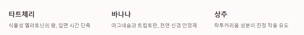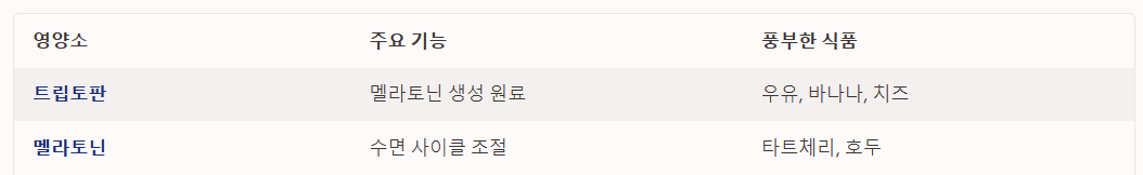 | 멜라토닌 | 수면 사이클 조절, 자연 수면 유도 | 타트체리, 호두, 토마토 |