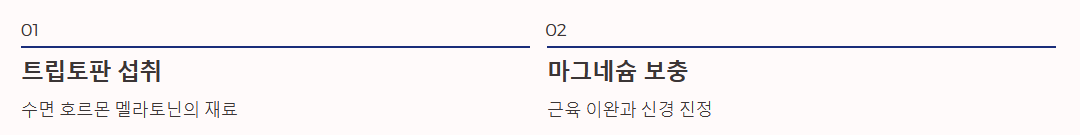 - 트립토판 섭취: 수면 호르몬인 '멜라토닌'의 재료가 되는 필수 아미노산입니다.