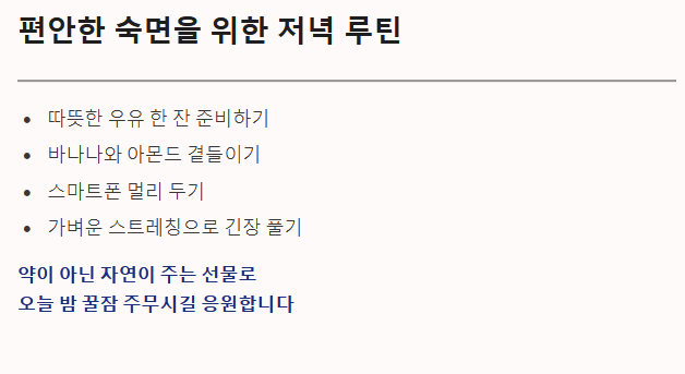 오늘 밤은 스마트폰을 멀리 두고, 따뜻한 우유 한 잔과 함께 가벼운 스트레칭으로 몸의 긴장을 풀어보는 건 어떨까요? 편안한 밤, 꿀잠 주무시길 응원합니다.