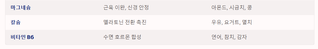| 비타민 B6 | 수면 호르몬 합성의 조효소 역할 | 연어, 참치, 감자, 병아리콩 |