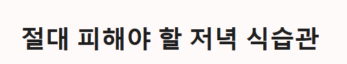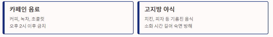 - 카페인: 커피뿐만 아니라 녹차, 초콜릿, 에너지 드링크에도 카페인이 있습니다. 민감한 사람은 오후 2시 이후 섭취를 금해야 합니다.