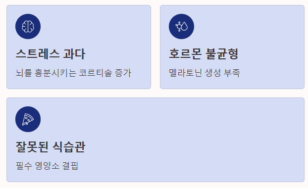 잠이 오지 않는 이유는 스트레스, 호르몬 불균형, 잘못된 식습관 등 다양합니다. 핵심은 뇌를 흥분시키는 요소를 줄이고, 안정을 주는 성분을 채워주는 것입니다.