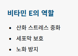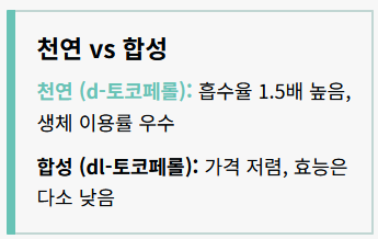 - 천연 비타민 E: 'd-' \(\alpha\)-토코페롤로 표기되며, 체내 흡수율과 생체 이용률이 합성보다 약 1.5배 높습니다.