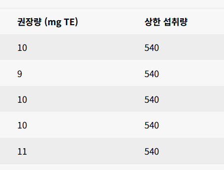 - 상한 섭취량 (UL): 하루 540mg TE (보충제 섭취 시 절대 초과 금지)