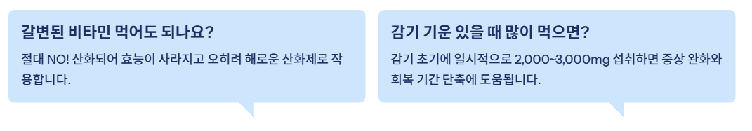 - 평소에 꾸준히 먹는 것이 가장 좋지만, 감기 초기 증상이 있을 때 일시적으로 섭취량을 늘리면(2,000~3,000mg) 증상 완화와 회복 기간 단축에 도움을 줄 수 있습니다.