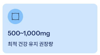 - 권장 섭취량: 성인 기준 최소 100mg, 최적 건강 유지 목적 시 500~1,000mg 추천