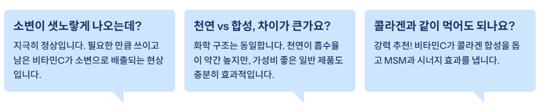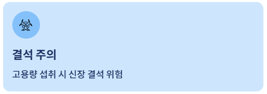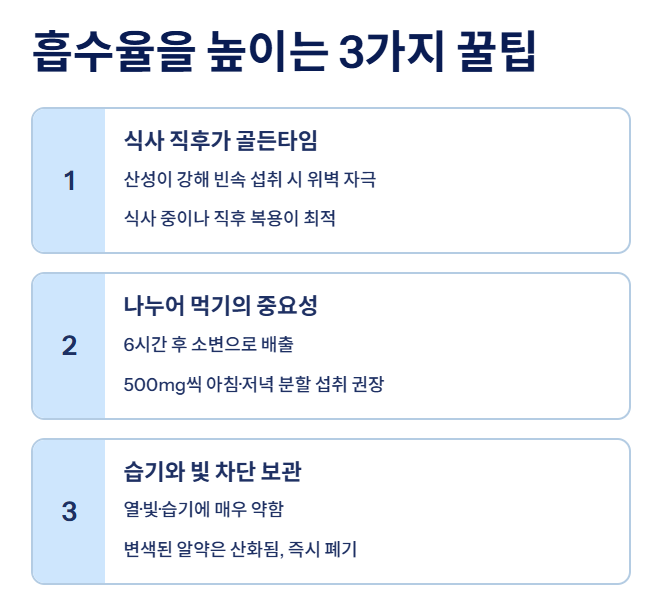 - 주의사항: 신장 결석 병력이 있다면 고용량(1,000mg 이상) 섭취 시 주의 필요