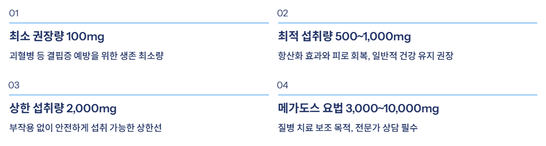 | 메가도스 요법 | 3,000 ~ 10,000mg | 질병 치료 보조나 강력한 항산화 목적 (전문가 상담 권장) |